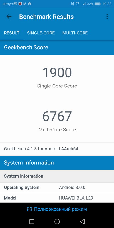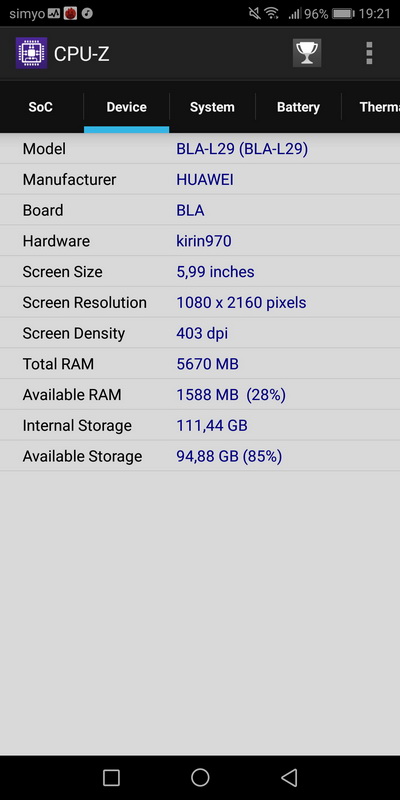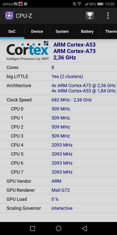 Процессор: Hisilicon Kirin 970, Octa-core (4x2.4 GHz Cortex-A73 & 4x1.8 GHz Cortex-A53)