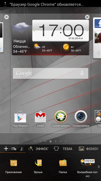 Третий рабочий стол с папками и виджетом Facebook.