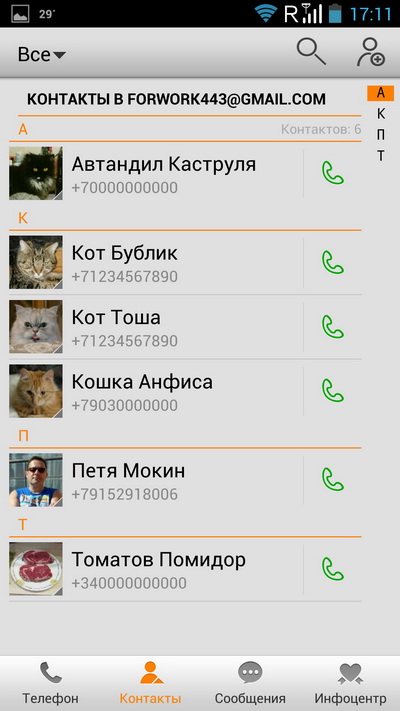 Контакты и меню контактов.
