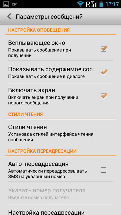 Настройки сообщений. Обратите внимание на то, что смартфон умеет выводить всплывающие окна с оповещениями.