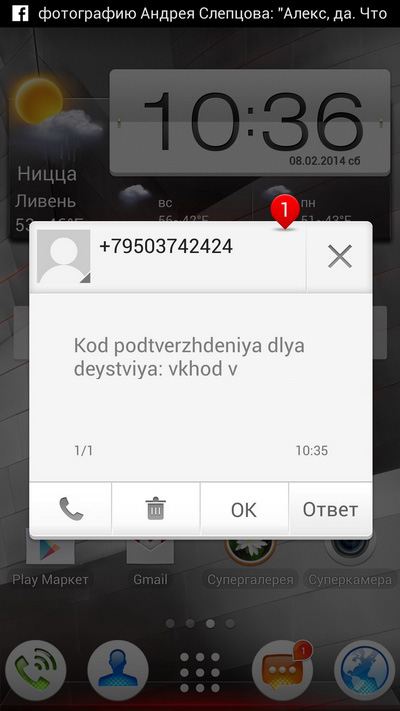 Входящий звонок. Можно ответить SMS со стандартным шаблоном.