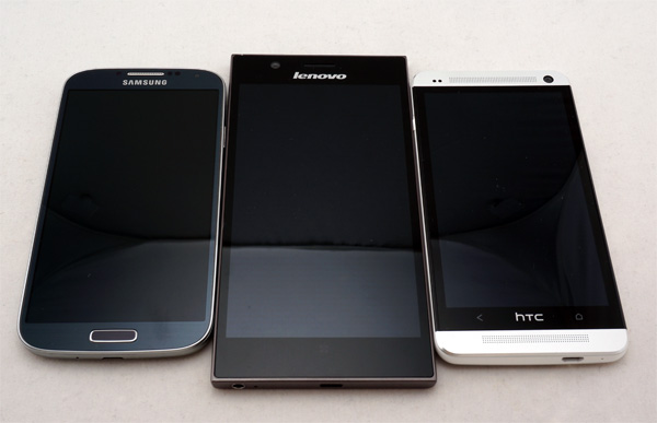 Ну и вот наш герой рядом с Samsung Galaxy S 4 и HTC One Dual Sim. Samsung рядом с ним смотрится как деревенский дедушка рядом со столичным пижоном.