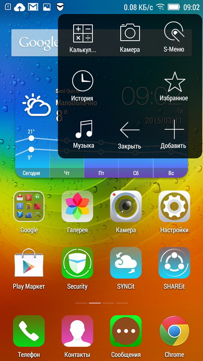 Пользователь может включать дополнительный набор пиктограмм S-меню, которое всегда находится на экране в произвольном месте в виде небольшой окружности и раскрывается при нажатии пальцем.