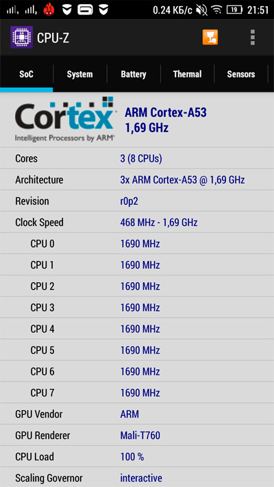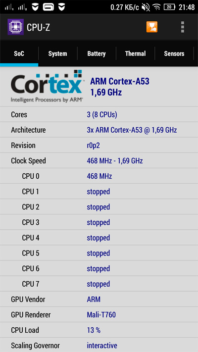 С помощью программы CPU-Z можно посмотреть, как это все выглядит. Вот, например, смартфон находится в режиме ожидания: работает только одно ядро на минимальной частоте.