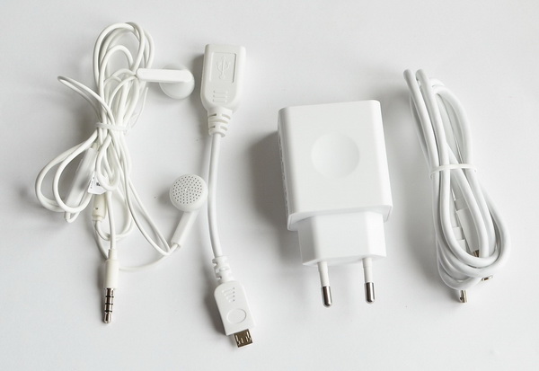 Внутри: смартфон, адаптер питания, кабель USB-microUSB, кабель USB под OTG (для подключения к смартфону флешек, также может использоваться для зарядки внешних устройств от аккумулятора смартфона), гарнитура-вкладка, брошюрки, крышка-чехол.