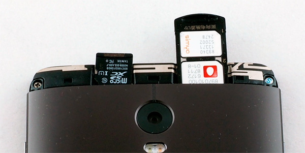Верхняя пластиковая вставка снимается, под ней находится выдвижной лоток под две nanoSIM, а карта памяти вставляется в свой отдельный отсек. Кстати, такое решение заметно удобнее, чем лоток, который надо вытаскивать с помощью скрепки/булавки.
