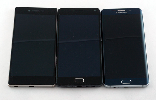 Ну и вот наш герой в окружении Samsung Galaxy S6 edge+ и Sony Xperia Z5. Galaxy S6 edge+, конечно, смотрится значительно щеголеватее, однако Lenovo Vibe P1 рядом с ним деревенским увальнем также не выглядит. Нормальный строгий дизайн, я бы так сказал.