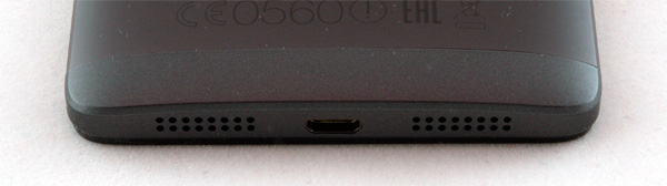 На нижнем торце: сетка, под которой скрываются динамик, порт microUSB, вторая сетка, под которой находится микрофон.