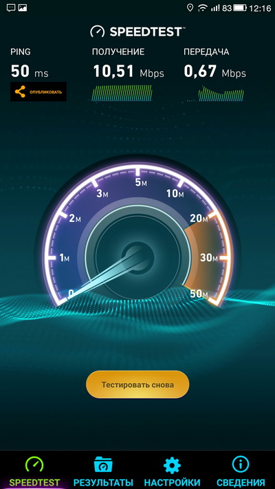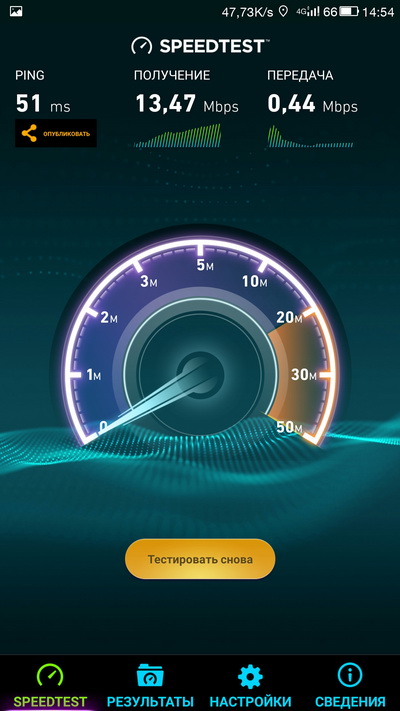 Тест мобильной связи входящую скорость показал очень высокую для данных условий, а выходная скорость передачи была низкой. Но это особенности связи в данной локации, такое бывает.