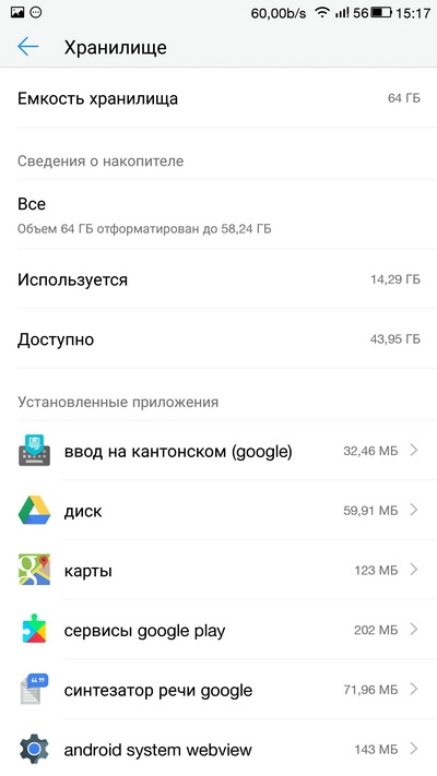 Из 64 Гб памяти пользователю доступно примерно 44 Гб.