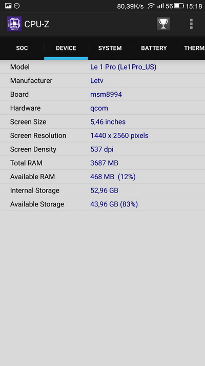 Итак, LeTV (LeEco) One Pro - 5,5" QHD, Qualcomm Snapdragon 810, оперативка 4 Гб, памяти 64 Гб, аккумулятор 3000 мА·ч.