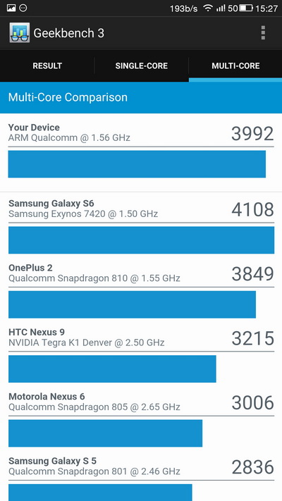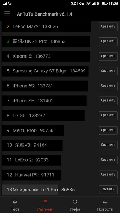 AnTuTu выдал ему 86 586. Это на уровне Huawei P9, который, между прочим, стоит в два с половиной раза дороже. В таблице AnTuTu этот смартфон попадает в первые пятнадцать смартфонов по быстродействию. Для сравнения, у Lenovo Vibe P1 - 42 477, а он стоит почти на треть дороже.