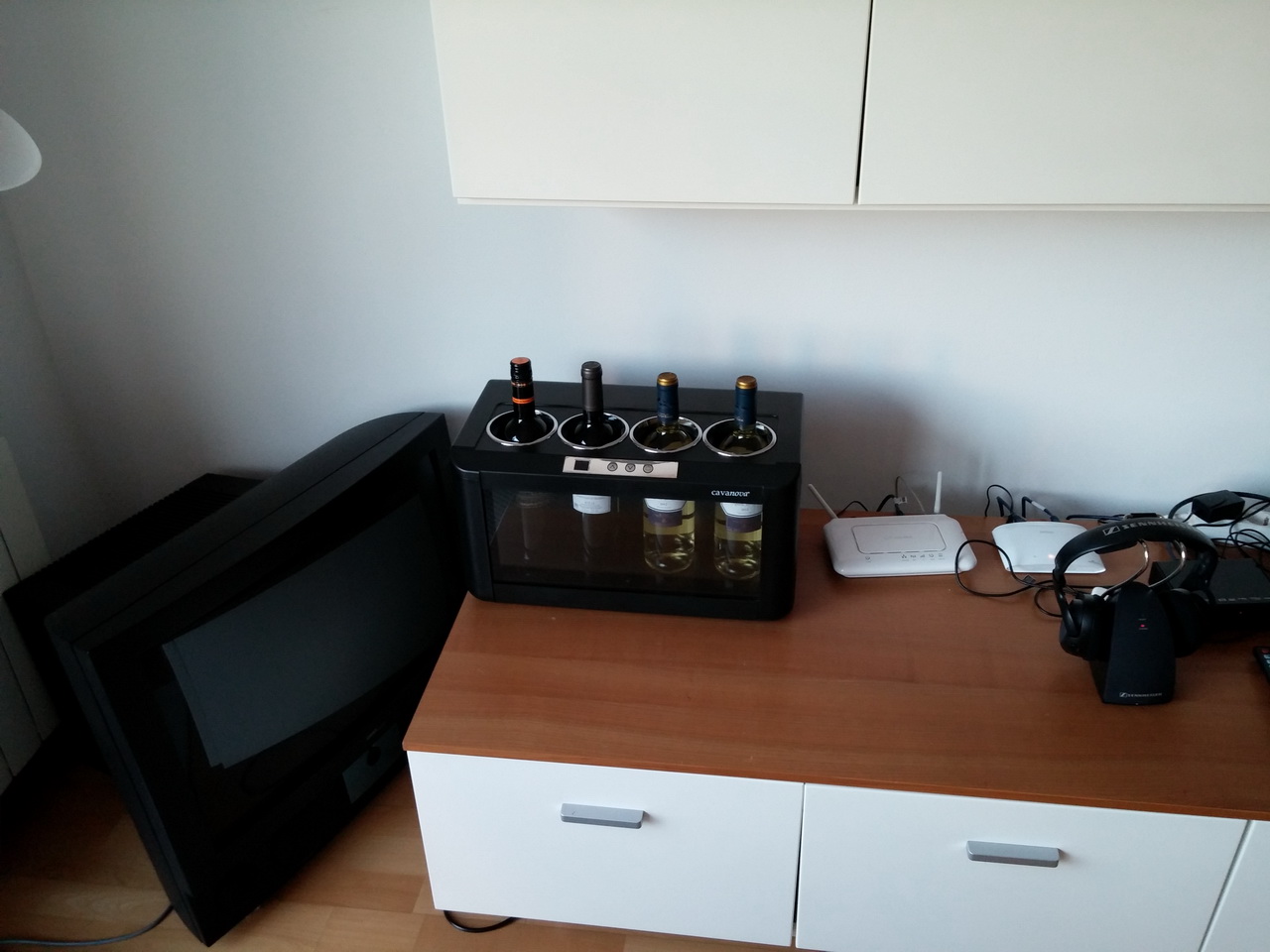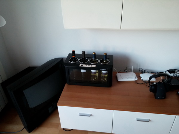 Алекс, подскажи пожалуйста, а что за гаджет у тебя стоит на тумбочке где роутеры? Поддерживает температуру определенную в бутылках, да? И телевизор теплый-ламповый классный какой! Работает? Как, кстати, обстоит дело с утилизацией электронных отходов в Испании, платить за это надо?