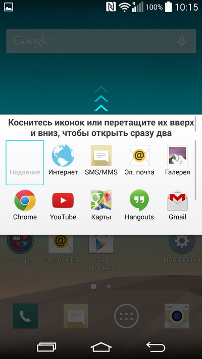 При нажатии на кнопку "Двойное окно" можно выбрать два приложения, которые одновременно будут находиться на экране.