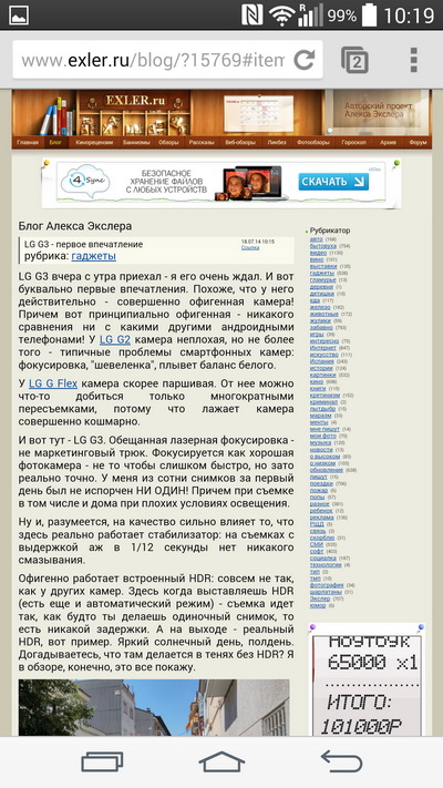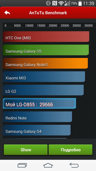 Vladimir: Но при этом на скрине сравнительные результаты теста LG G2 визуально процентов на 5 больше чем 29666. Вероятнее всего оба аппарата ты тестировал в режиме энергосбережения.