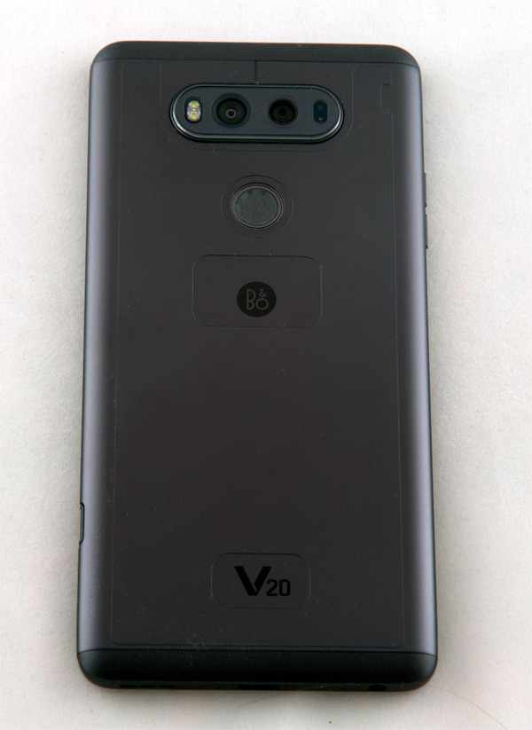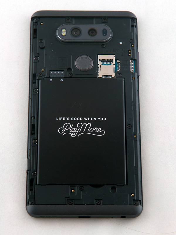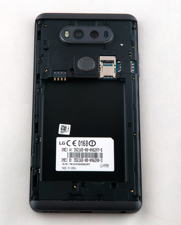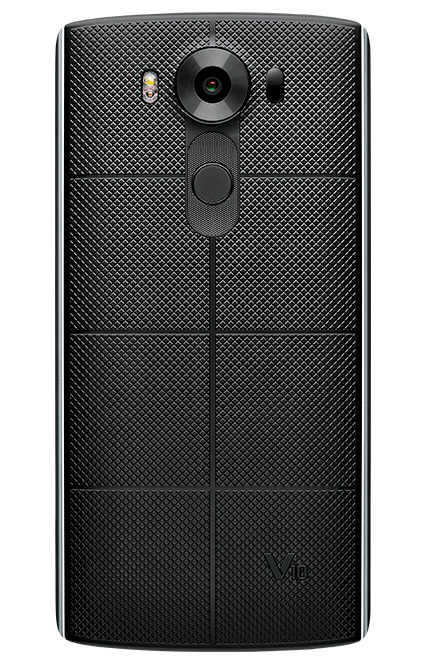 В сравнении с LG V10 задняя крышка заметно изменилась. У LG V10 сзади присутствовала фирменная кнопка G - комбинация кнопки питания, сканера отпечатка и регулировки громкости. Также там крышка была несъемной и имела специальную силиконовую шероховатую структуру, благодаря которой смартфон очень ухватисто лежал в руке.