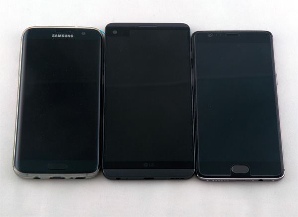 Ну и вот V20 рядом с Samsung Galaxy S7 edge и OnePlus 3T.