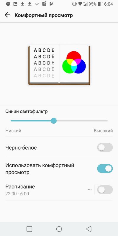Еще можно включать (в том числе и по расписанию) режим "Комфортный просмотр" - там настраивается синий светофильтр, благодаря чему цвета уходят в теплую гамму и при недостаточном освещении на такой дисплей смотреть намного комфортнее (особенно когда читаешь почти в темноте). Так что настройка вполне полезная.