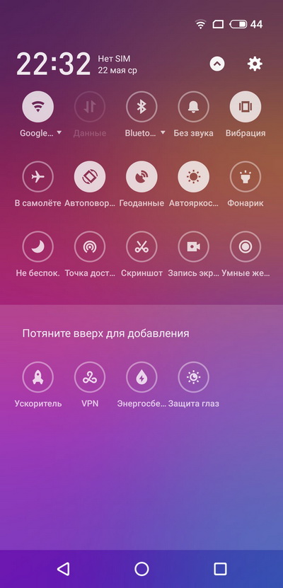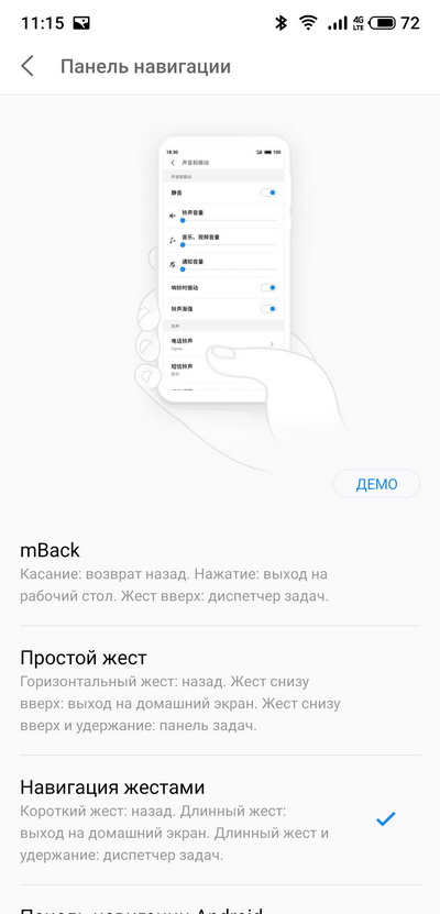 С управлением здесь все достаточно разнообразно. Кроме стандартных андроидных навигационных кнопок (кнопку "Возврат" можно поставить и вправо, и влево) здесь есть аж три варианта жестов: жесты по одной экранной кнопке (похожий на старый режим навигации Meizu, когда там была одна сенсорная кнопка), стандартные андроидные жесты (горизонтальный, короткий снизу, снизу с удержанием) и жесты только снизу - в общем, на любой вкус, это удобно.
