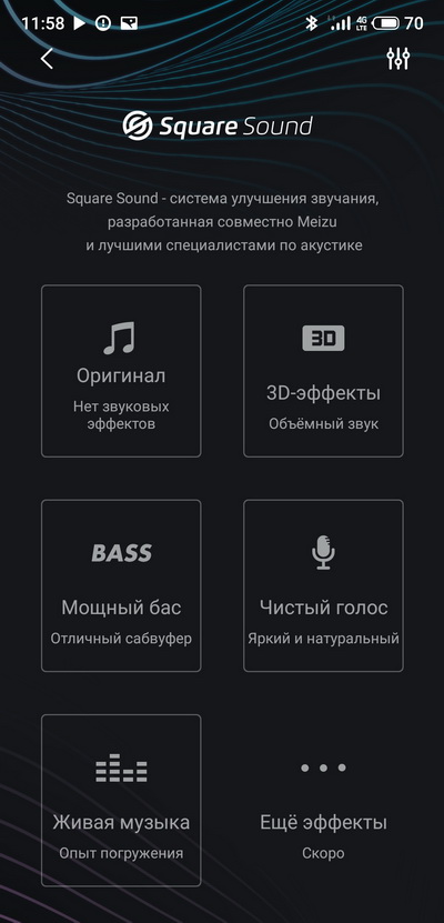 Для проводных наушников можно использовать специальный режим Square Sound, но я там никакого реального улучшения не заметил, а вот ухудшения звучания - сколько угодно. Особенно "мощный бас" - просто позорище: зарезают к чертям высокие и средние, бас становится гулким, как сквозь подушку.
