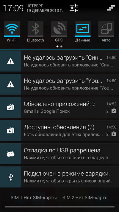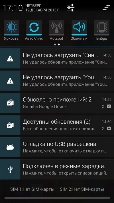Область уведомлений с переключателями сверху.