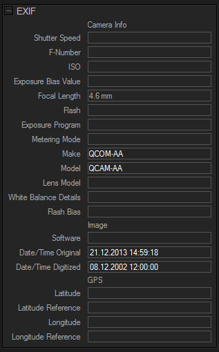 Камера обладает одной очень странной особенностью: она при съемке почти ничего не пишет в EXIF кадра. Только дату, модель камеры и фокусное расстояние, которое, разумеется, фиксированное. Вот как это выглядит.