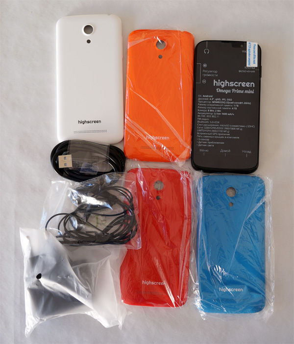 Внутри: смартфон, провод USB-microUSB, гарнитура, адаптер питания и "неделька" - четыре дополнительные задние крышки различных цветов.