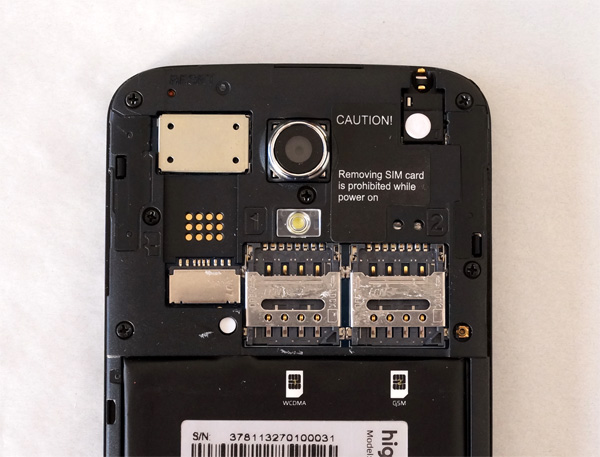 Там же слот под microSD и слоты под микро-сим-карты. Надпись гласит, что карты категорически запрещается менять при включенном телефоне. Это тоже слегка странно: все телефоны, что мне попадались, совершенно нормально воспринимали "горячую" замену симки.