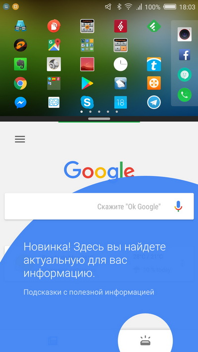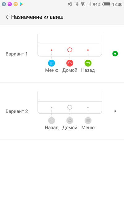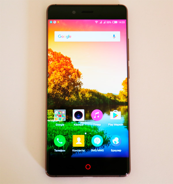 Управляющие кнопки здесь сенсорные, экран не занимают. Кнопка "Домой" традиционно для Nubia маркированакрасной окружностью, которая при включении подсвечивается и одновременно служит индикатором (звонки, сообщения, зарядка). Другие две кнопки подсвечиваются точками только в момент использования. Маркировка здесь не нанесена, да и кнопки вы можете менять в настройках. По умолчанию левая кнопка - меню, правая - возврат, длинное нажатие правой - список запущенных приложений, длинное нажатие "Домой" - Google Now.