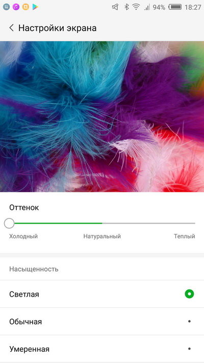 Настройки цвета по умолчанию для некоторых пользователей могут показаться уж слишком насыщенными и холодноватыми, однако вы можете здесь регулировать как оттенки (от холодного через нейтральный к теплому), так и насыщенность: светлая, обычная, умеренная.