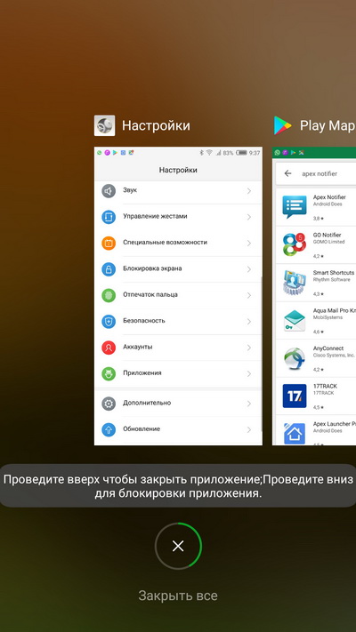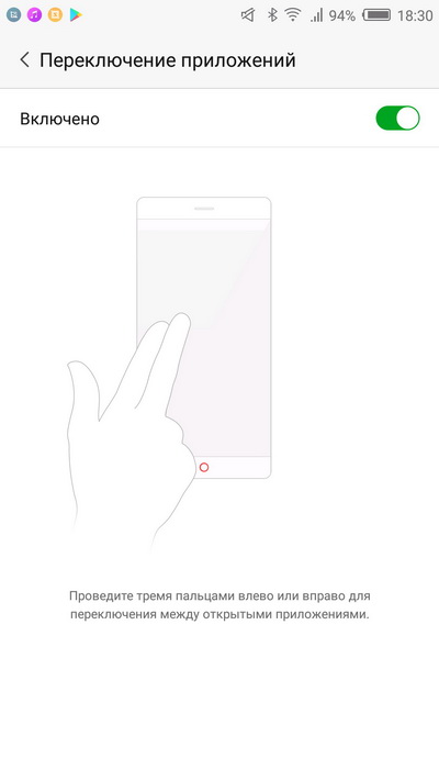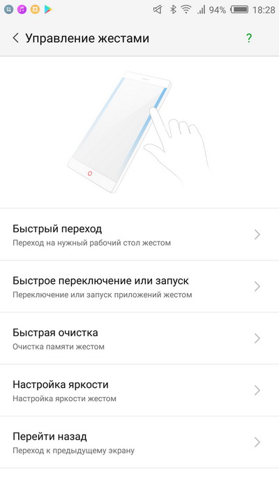 Жест вверх-вниз с верхнего-нижнего края экрана - переключение или запуск приложений: это настраивается - вы можете переключаться между запущенными приложениями или запускать конкретные приложения определенными жестами сверху или снизу. (Очень удобная штука, постоянно пользовался.)