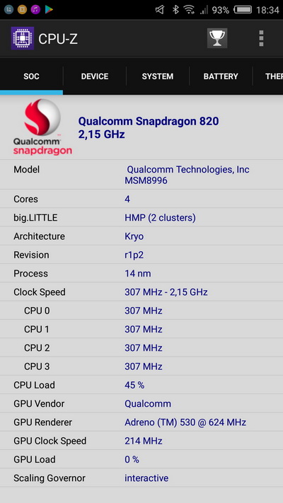 Процессор: Qualcomm Snapdragon 820, 4 ядра Kryo (ARMv8)