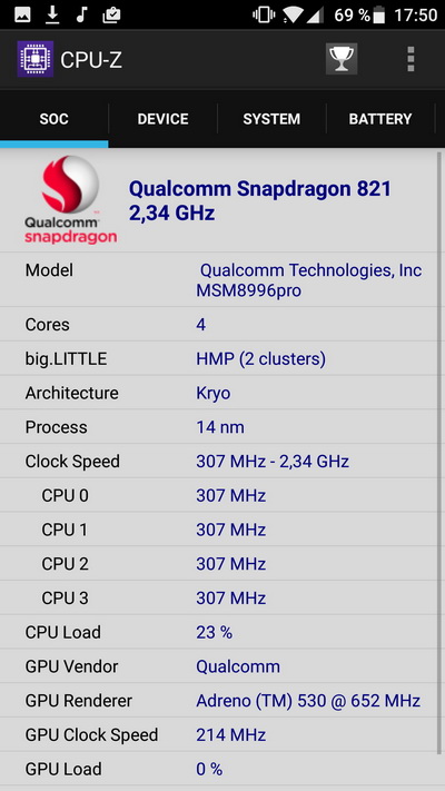 Процессор: Qualcomm Snapdragon 821, 4-ядерный (2x2.35 GHz Kryo & 2x1.6 GHz Kryo)