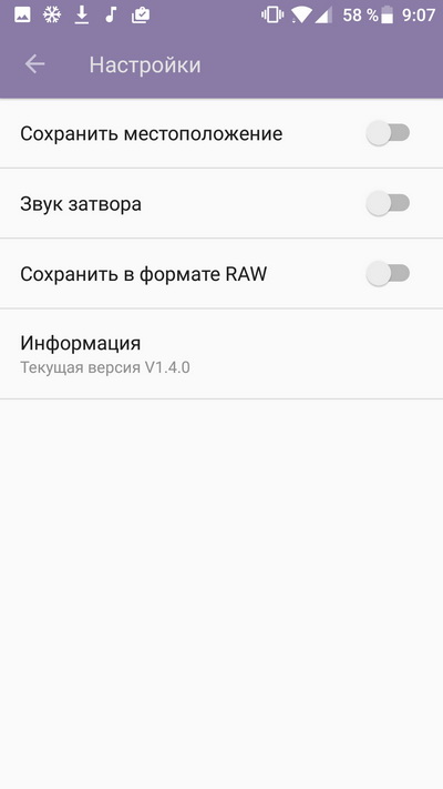 Настройки. (Да, умеет сохранять в формате RAW.)