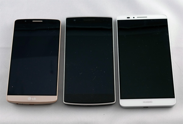 Ну и наш герой рядом с Huawei Ascend Mate 7 и LG G3.