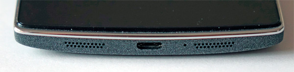 Нижний торец - динамики (очень удачное положение: не глушатся ни при каких обстоятельствах использования), выход microUSB и основной микрофон.