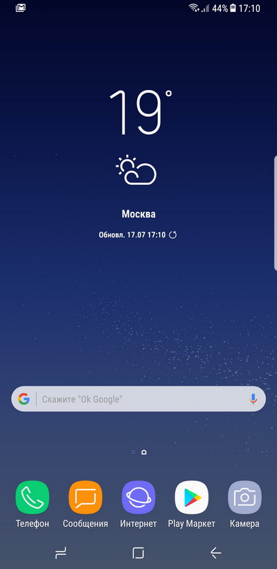 Главный десктоп. Дектоп слева - помощник Bixby, на который в Samsung возлагают большие надежды, поэтому продвигают его всевозможными и не всегда корректными способами, хотя этот помощник пока работает совсем не так, как анонсировали.
