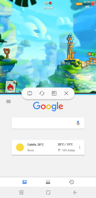 Есть режим двухоконной работы, также системные приложения можно переводить в маленькие окна и в режим пиктограммы открытого приложения, которая будет видна на любом десктопе, и ее можно перемещать по экрану.