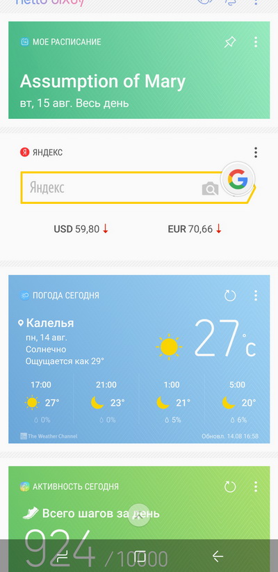 Помощник Bixby на данный момент выглядит как-то так - набор виджетов различных приложений, которые можно подключать, отключать и так далее.