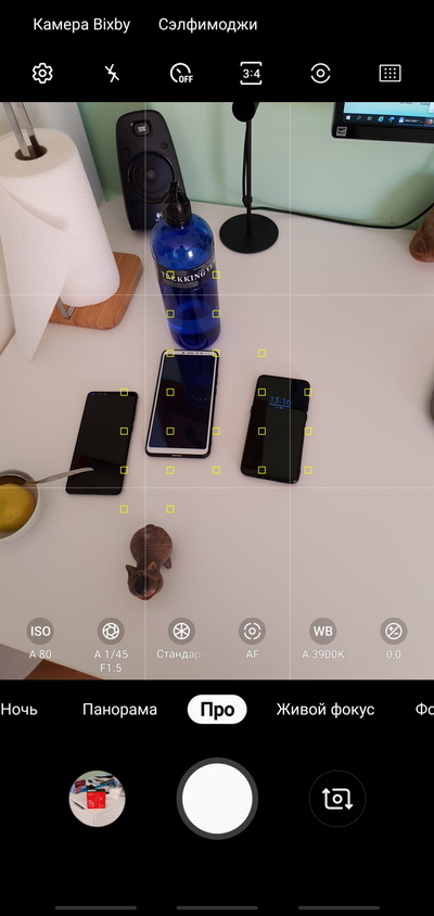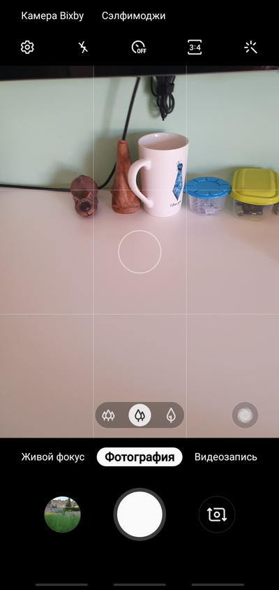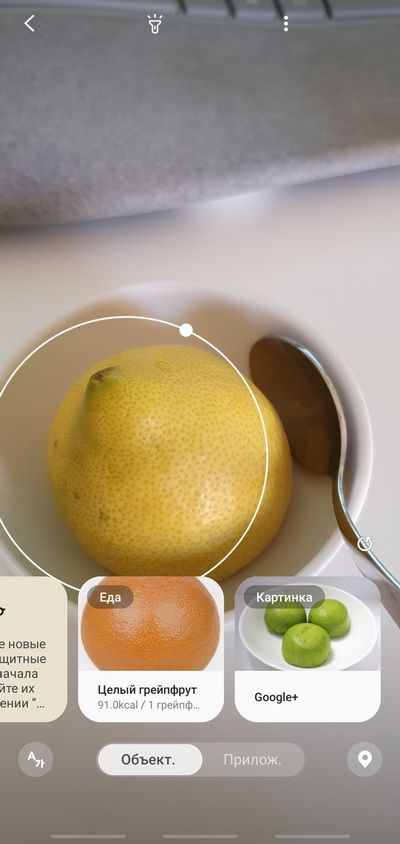 Камера Bixby. Пытается определить объекты и найти им соответствие в Интернете. Для продуктов выводит их состав и калорийность. Потестировал, все это работает довольно криво.