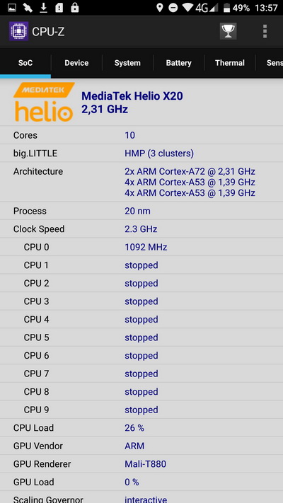 Похоже, что проблема именно в Helio X20, раз такая же ситуация у F7 Pro на той же платформе. Я было подумал, что там ядра в режиме покоя не останавливаются или останавливаются не до конца - ан нет, по CPU-Z видно, что прекрасно останавливаются.