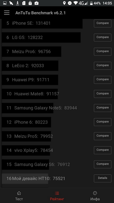AnTuTu выдал 75 521 единицу, это довольно много - 16-е место в списке. Что интересно, у Doogee F7 Pro на том же чипсете - 46 494. Ученым еще только предстоит объяснить этот факт.