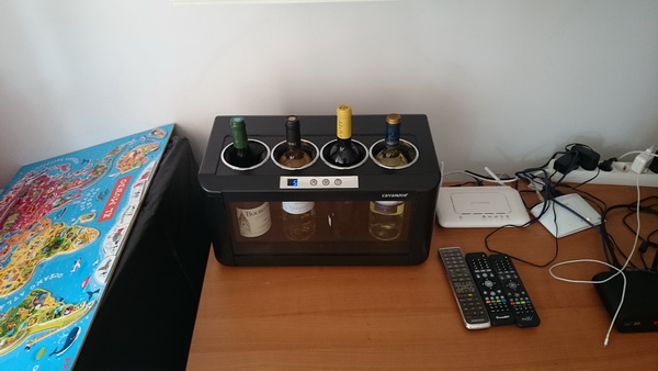 Обычный тиристорный холодильничек для вина. В жару, правда, холод держит плоховато, но все лучше, чем комнатная температура.