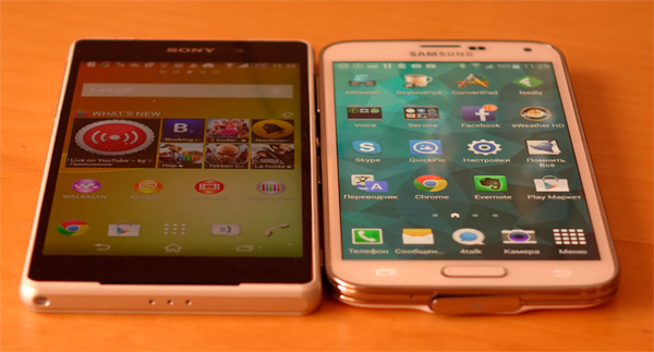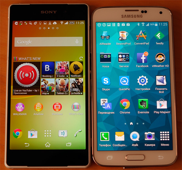 Попробую показать это на фото. Вот Xperia Z2 и Galaxy S5 с дисплеями на полной яркости.