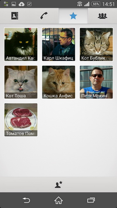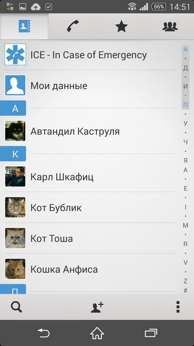 Контакты. (Поиск работает по отдельной пиктограмме.)