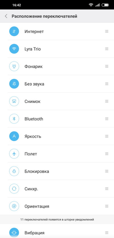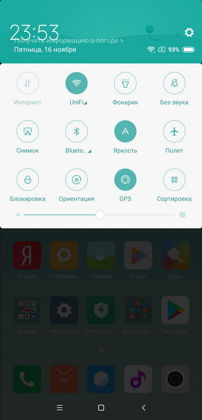 Быстрые переключатели. Здесь немножко нетипично сделано. У остальных Xiaomi эти переключатели расположены на двух окнах, переключаемых по горизонтали, а здесь только одно.
