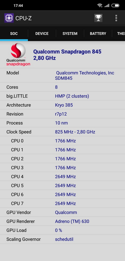 Процессор: Qualcomm Snapdragon 845 (8-ядерный, архитектура Kryo 385), технология LiquidCool
