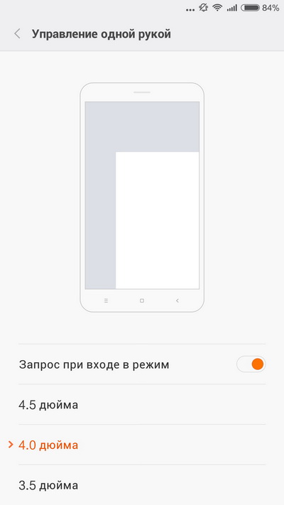 Режим управления одной рукой, причем его даже можно затачивать под различные желаемые диагонали экрана.