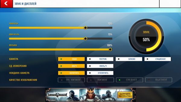 Asphalt 8 выставлял среднее качество изображения, однако игра смотрелась очень хорошо и работала шустро. На высокое качество в настройках переключить игра не давала.