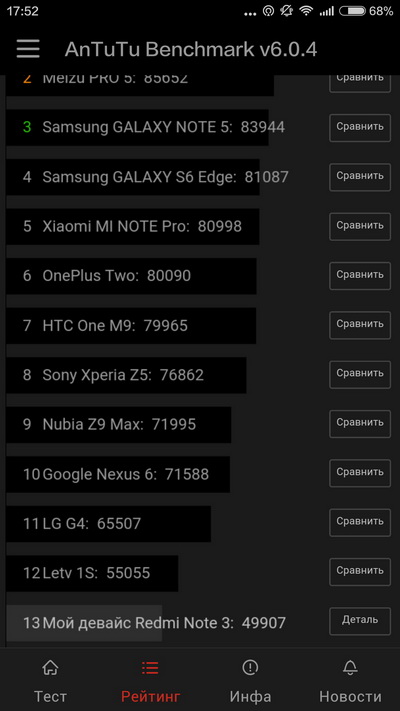 Однако чисто внешне Redmi Note 3 выглядит лучше, чем вышеперечисленные смартфоны. Черт его знает почему: то ли надписи на сенсорных кнопках выполнены более аккуратно, то ли окантовка по краям тоньше, чем у остальных (она у всех перечисленных смартфонов присутствует), то ли еще что. Вот сформулировать трудно, но чисто визуально телефончик смотрится очень приятно. Нет, видно, что не флагман-расфлагман, но и однозначно не дешевка.